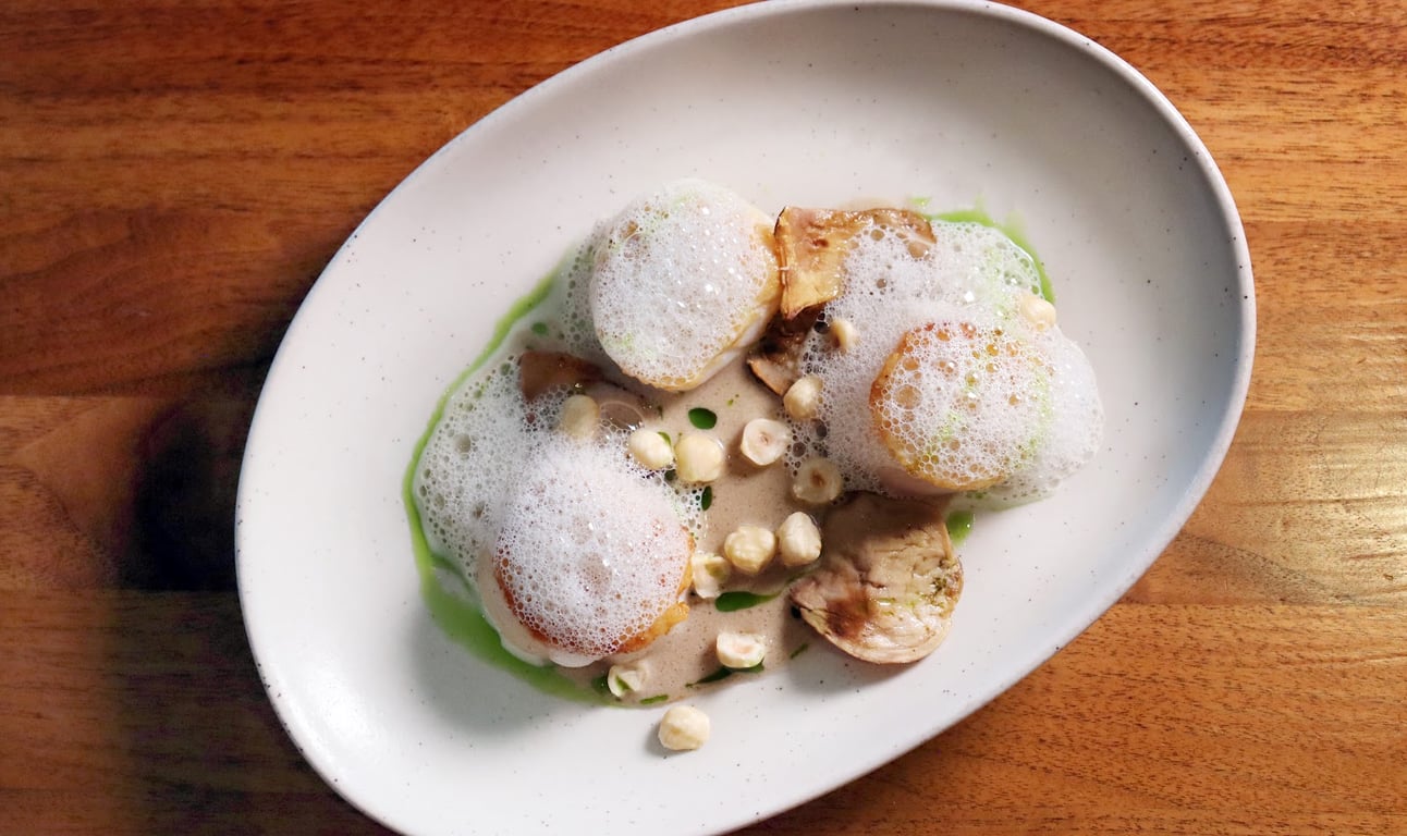 "Complimentary creamy goat cheese in a delicate funnel with artisanal bread and butter. Appetizers: Pan-seared Sea Scallops with parmesan foam, porcini cream, chive oil, and hazelnuts, perfectly cooked for a tender mouthfeel. 14-day Dry-Aged Duck breast, cooked medium-rare, served with cauliflower puree, parsnip, and gooseberry sauce, garnished with nasturtium. Australian lamb chops, brined in lemon juice, salt, and pepper. Accompanied by a side of asparagus in sun-dried tomato sauce."