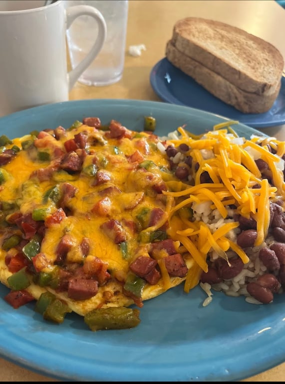 "Recommend breakfast only here. Ordered red beans and rice, which was odd by usual standards. So-so. Husband ordered a Reuben, which he liked. I didn't."